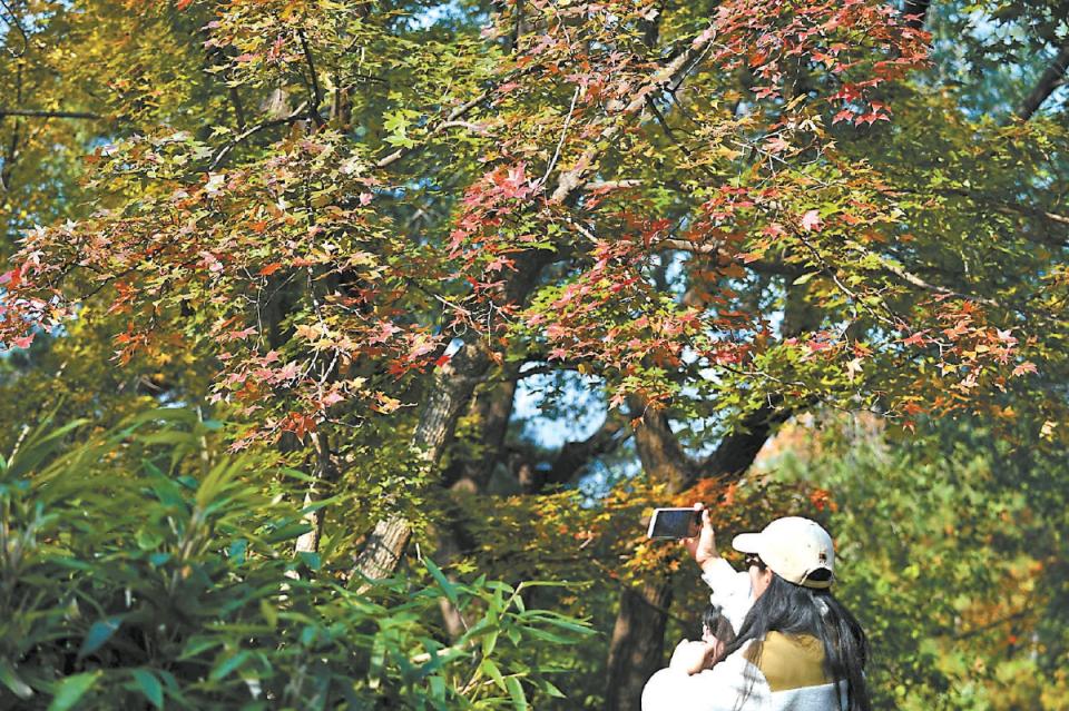 国度植物园里,搭客用手机拍下秋色
