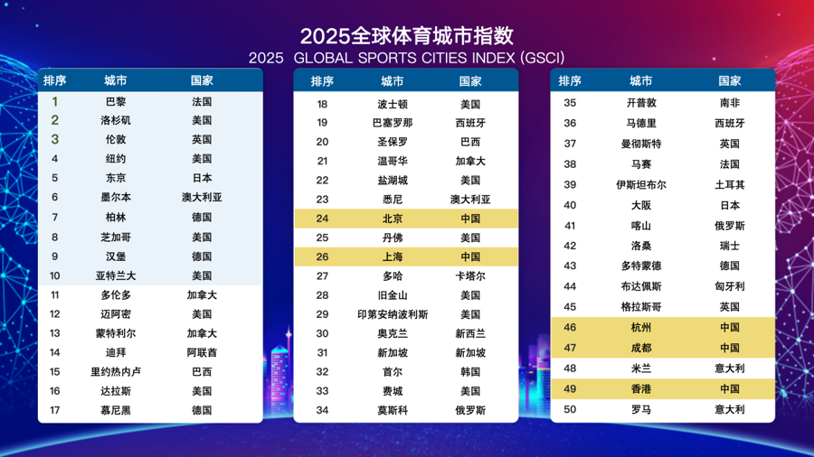 刘东锋解释补充先容:“中国城市的露出尤为亮眼,北京(第24位)、上海(第26位)、杭州(第46位)、成王人(第47位)、香港(第49位)五城得手入围全球50强,较往年排名稳步莳植,这标明中国城市在赛事运营、体育产业生态构建、寰球体育办事等方面的详细实力,已得到外洋社会的平庸认同。”