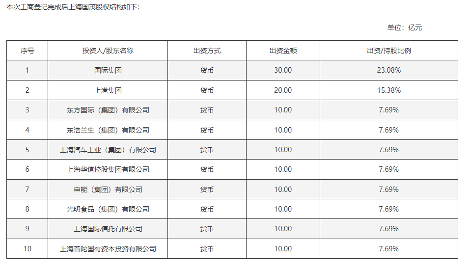凭证上港集团(600018)公告,上海国茂控股有限公司股权结构如下:上海外洋集团有限公司出资30亿元,捏股比例23.08%;上港集团出资20亿元,捏股比例15.38%;其他8家上海市国资监管企业或其指定主体所有出资80亿元,所有捏股比例61.54%。
