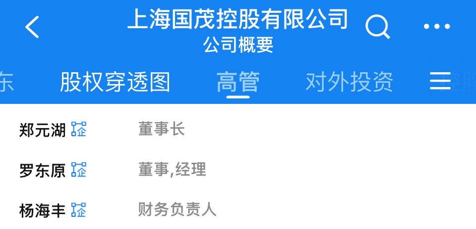 高管信息表示,郑元湖任上海国茂控股有限公司董事长;罗东原任董事,司理;杨海丰任财务追究东说念主。